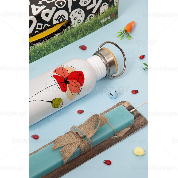 Red poppy flowers papaver, Πασχαλινή Λαμπάδα με παγούρι μεταλλικό (620ml, stainless steel) & κερί αρωματικό πλακέ (30cm) (ΤΙΡΚΟΥΑΖ)