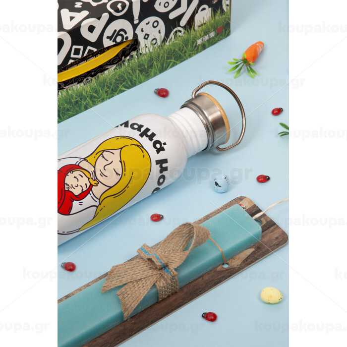Μανούλα σ'αγαπώ αγκαλιά!, Πασχαλινή Λαμπάδα με παγούρι μεταλλικό (620ml, stainless steel) & κερί αρωματικό πλακέ (30cm) (ΤΙΡΚΟΥΑΖ)