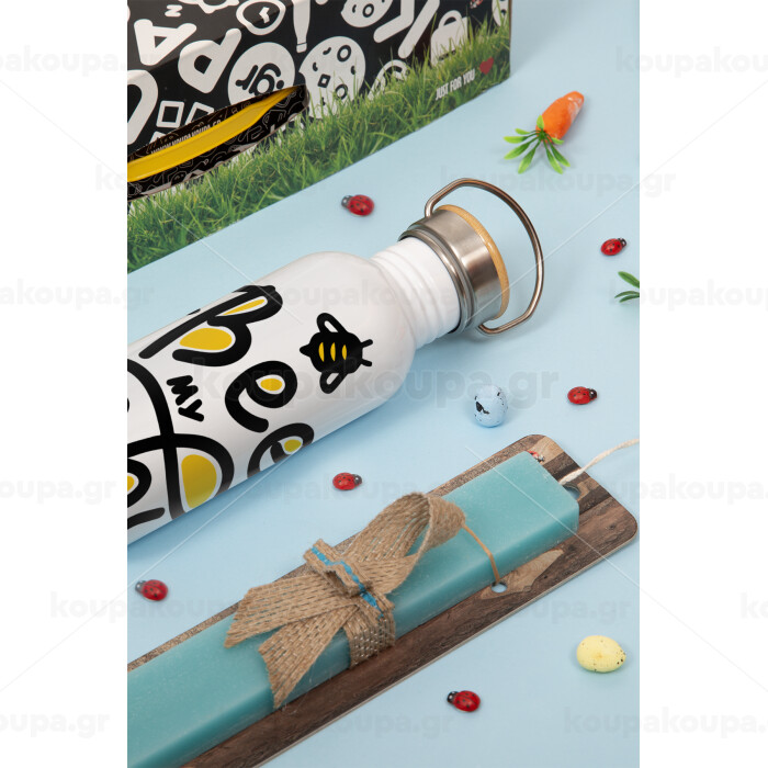 Bee my BABY!!!, Πασχαλινή Λαμπάδα με παγούρι μεταλλικό Ασημένιο αλουμινίου (500ml) & κερί αρωματικό πλακέ (30cm) (ΤΙΡΚΟΥΑΖ)