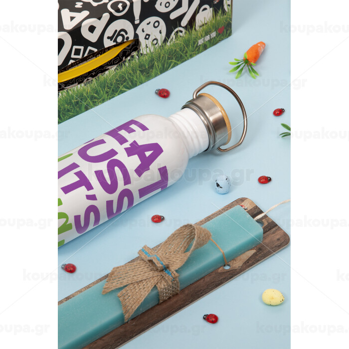 EAT pussy it's vegan, Πασχαλινή Λαμπάδα με παγούρι μεταλλικό Ασημένιο αλουμινίου (500ml) & κερί αρωματικό πλακέ (30cm) (ΤΙΡΚΟΥΑΖ)