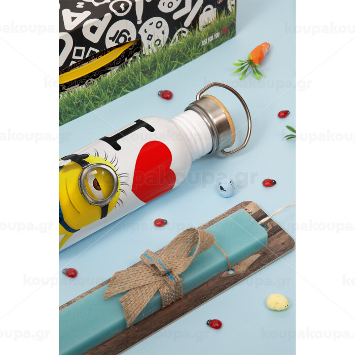 I love by minion, Πασχαλινή Λαμπάδα με παγούρι μεταλλικό Ασημένιο αλουμινίου (500ml) & κερί αρωματικό πλακέ (30cm) (ΤΙΡΚΟΥΑΖ)