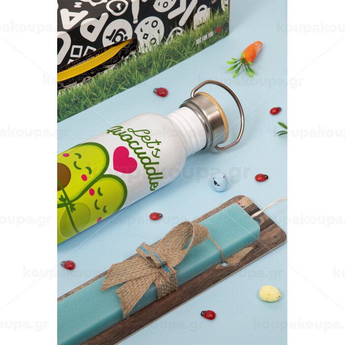 Let's avocuddle, Πασχαλινή Λαμπάδα με παγούρι μεταλλικό Ασημένιο αλουμινίου (500ml) & κερί αρωματικό πλακέ (30cm) (ΤΙΡΚΟΥΑΖ)