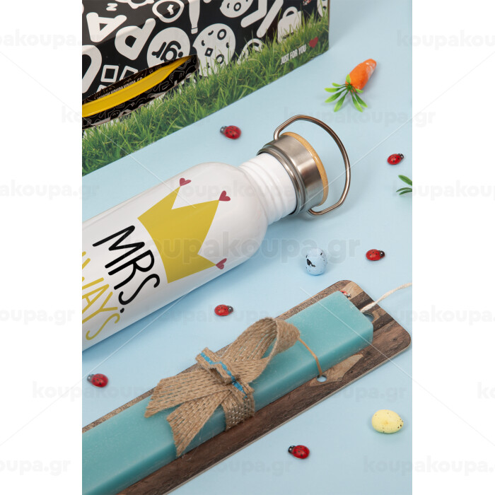 Mrs "Always" right, Πασχαλινή Λαμπάδα με παγούρι μεταλλικό Ασημένιο αλουμινίου (500ml) & κερί αρωματικό πλακέ (30cm) (ΤΙΡΚΟΥΑΖ)
