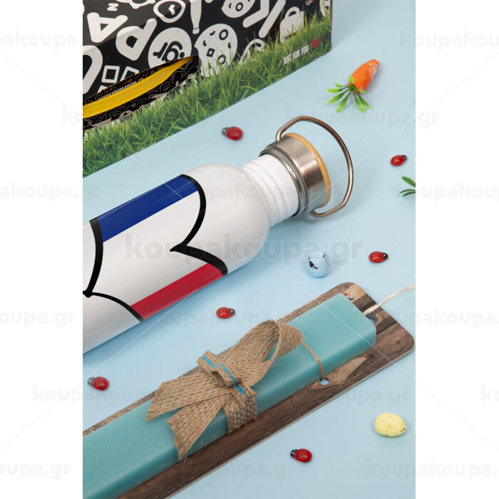 France flag, Πασχαλινή Λαμπάδα με παγούρι μεταλλικό (620ml, stainless steel) & κερί αρωματικό πλακέ (30cm) (ΤΙΡΚΟΥΑΖ)