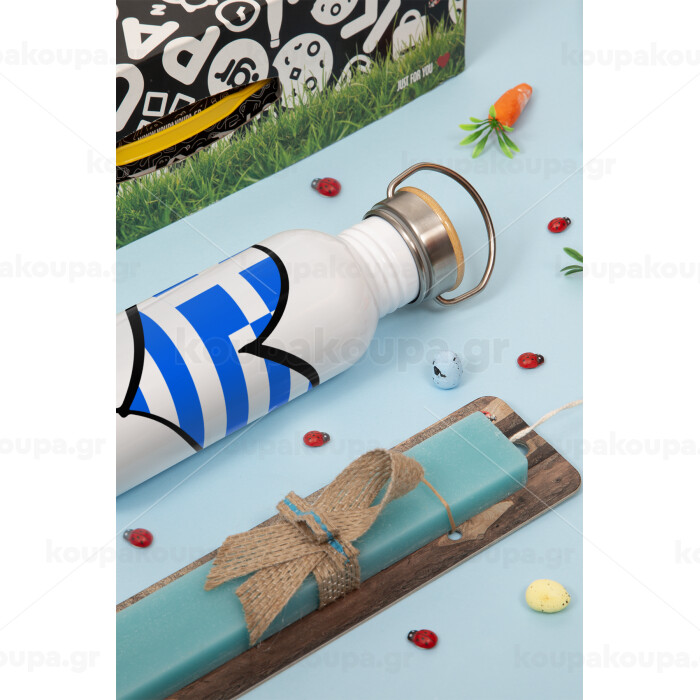 Greece flag, Πασχαλινή Λαμπάδα με παγούρι μεταλλικό (620ml, stainless steel) & κερί αρωματικό πλακέ (30cm) (ΤΙΡΚΟΥΑΖ)