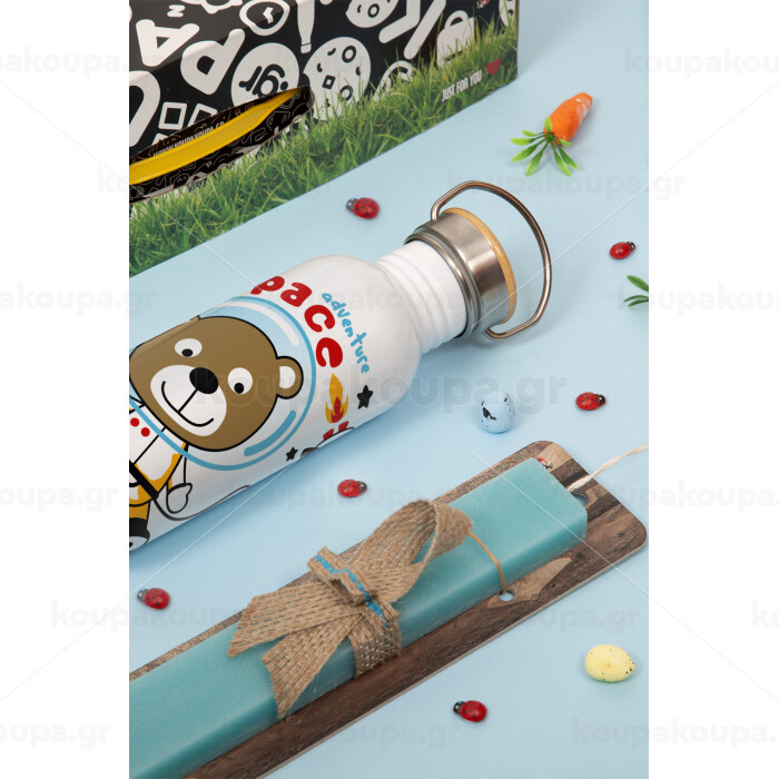 Ο μικρός αστροναύτης, Πασχαλινή Λαμπάδα με παγούρι μεταλλικό (620ml, stainless steel) & κερί αρωματικό πλακέ (30cm) (ΤΙΡΚΟΥΑΖ)