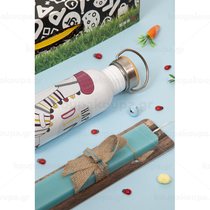 Happy Dino, Πασχαλινή Λαμπάδα με παγούρι μεταλλικό (620ml, stainless steel) & κερί αρωματικό πλακέ (30cm) (ΤΙΡΚΟΥΑΖ)