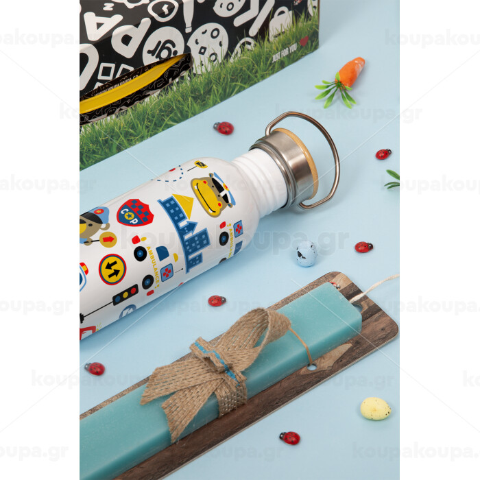 Rescue team cartoon, Πασχαλινή Λαμπάδα με παγούρι μεταλλικό (620ml, stainless steel) & κερί αρωματικό πλακέ (30cm) (ΤΙΡΚΟΥΑΖ)