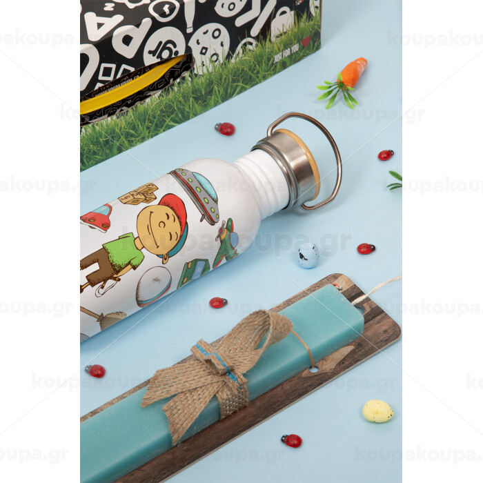 Toys Boy, Πασχαλινή Λαμπάδα με παγούρι μεταλλικό (620ml, stainless steel) & κερί αρωματικό πλακέ (30cm) (ΤΙΡΚΟΥΑΖ)