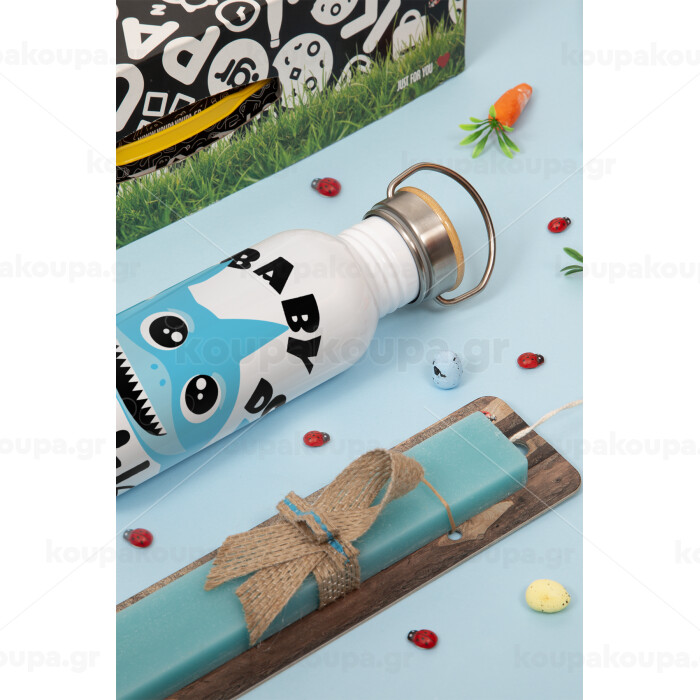 Baby Shark (boy), Πασχαλινή Λαμπάδα με παγούρι μεταλλικό (620ml, stainless steel) & κερί αρωματικό πλακέ (30cm) (ΤΙΡΚΟΥΑΖ)