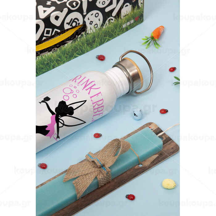 Drinkerbell bachellor, Πασχαλινή Λαμπάδα με παγούρι μεταλλικό (620ml, stainless steel) & κερί αρωματικό πλακέ (30cm) (ΤΙΡΚΟΥΑΖ)