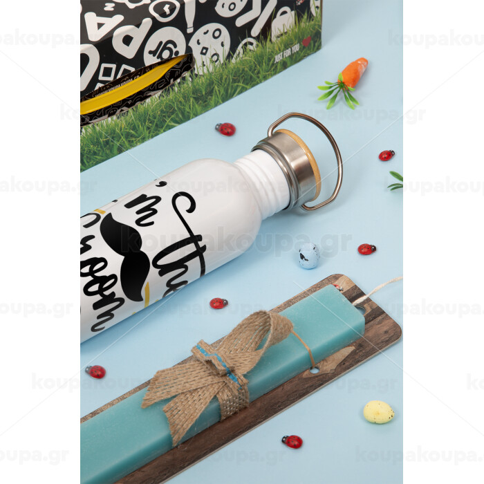 I'm the groom mustache, Πασχαλινή Λαμπάδα με παγούρι μεταλλικό (620ml, stainless steel) & κερί αρωματικό πλακέ (30cm) (ΤΙΡΚΟΥΑΖ)