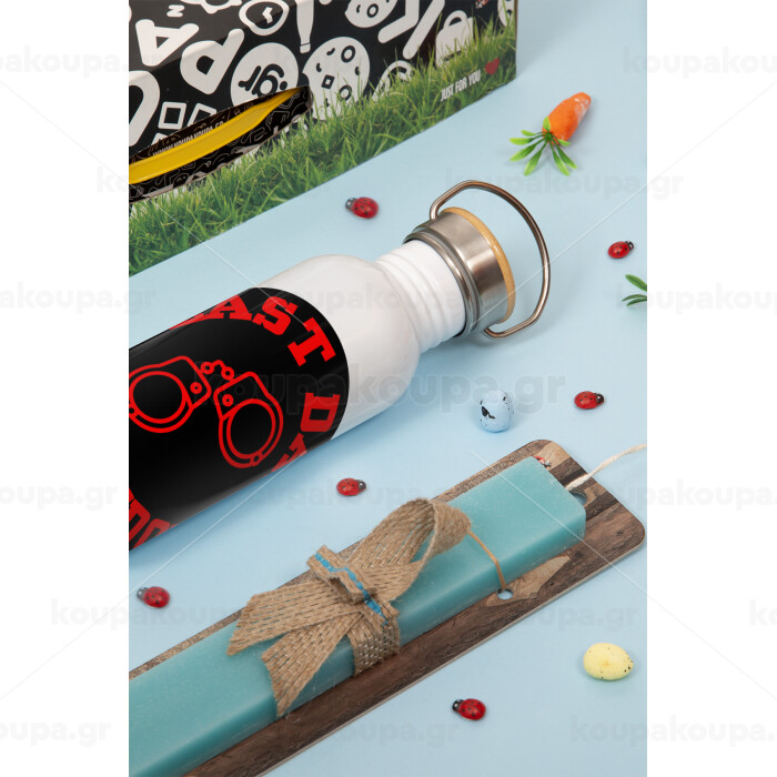 Last day in freedom, Πασχαλινή Λαμπάδα με παγούρι μεταλλικό (620ml, stainless steel) & κερί αρωματικό πλακέ (30cm) (ΤΙΡΚΟΥΑΖ)