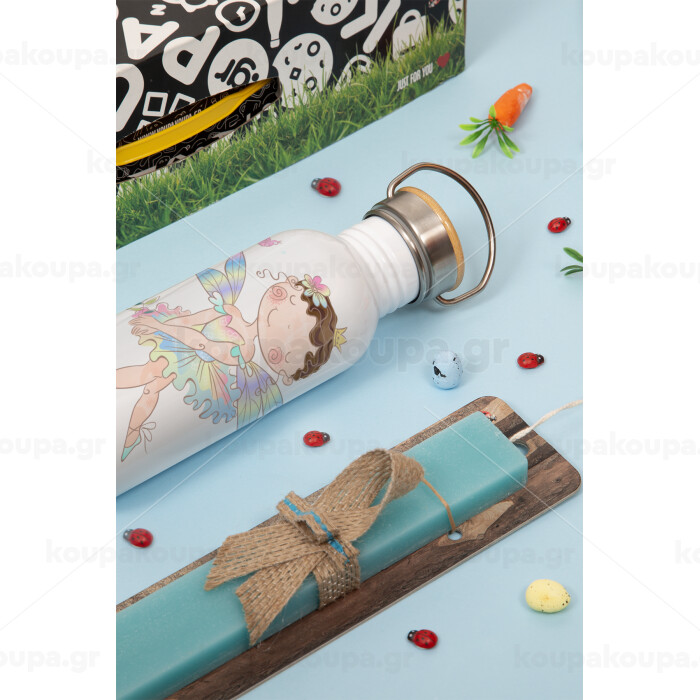 Η νονά μου, Νεράϊδα, Πασχαλινή Λαμπάδα με παγούρι μεταλλικό (620ml, stainless steel) & κερί αρωματικό πλακέ (30cm) (ΤΙΡΚΟΥΑΖ)
