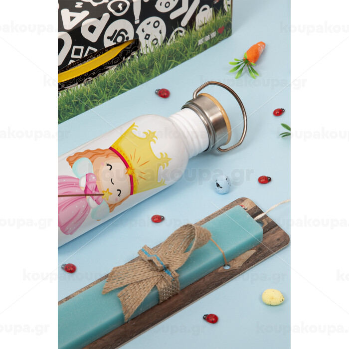 Η νονά μου, πριγκίπισσα, Πασχαλινή Λαμπάδα με παγούρι μεταλλικό (620ml, stainless steel) & κερί αρωματικό πλακέ (30cm) (ΤΙΡΚΟΥΑΖ)
