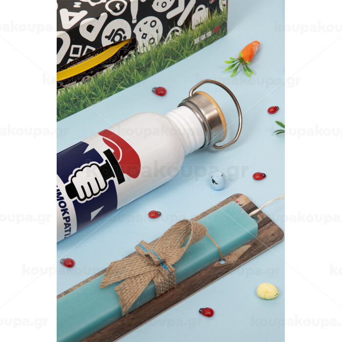 Νέα δημοκρατία κλασική, Πασχαλινή Λαμπάδα με παγούρι μεταλλικό (620ml, stainless steel) & κερί αρωματικό πλακέ (30cm) (ΤΙΡΚΟΥΑΖ)