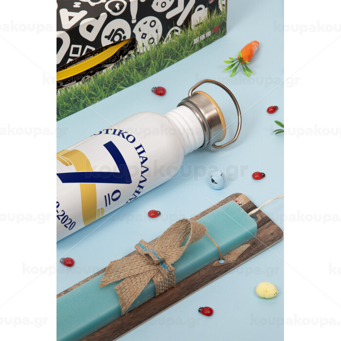 Σχολική μπλε με κορδέλα, Πασχαλινή Λαμπάδα με παγούρι μεταλλικό (620ml, stainless steel) & κερί αρωματικό πλακέ (30cm) (ΤΙΡΚΟΥΑΖ)