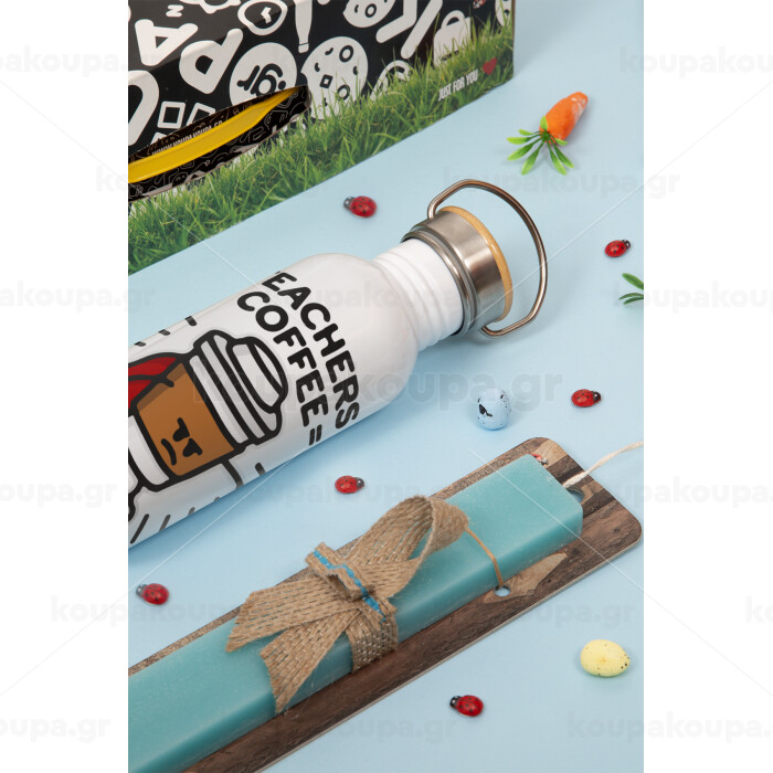 Teacher Coffee Super Power, Πασχαλινή Λαμπάδα με παγούρι μεταλλικό (620ml, stainless steel) & κερί αρωματικό πλακέ (30cm) (ΤΙΡΚΟΥΑΖ)