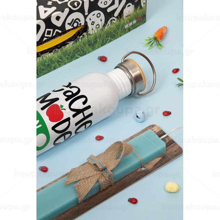 Teacher mode ON, Πασχαλινή Λαμπάδα με παγούρι μεταλλικό (620ml, stainless steel) & κερί αρωματικό πλακέ (30cm) (ΤΙΡΚΟΥΑΖ)