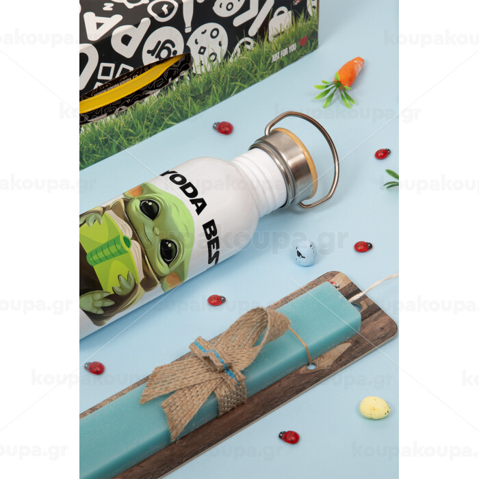 Yoda Best Teacher, Πασχαλινή Λαμπάδα με παγούρι μεταλλικό (620ml, stainless steel) & κερί αρωματικό πλακέ (30cm) (ΤΙΡΚΟΥΑΖ)
