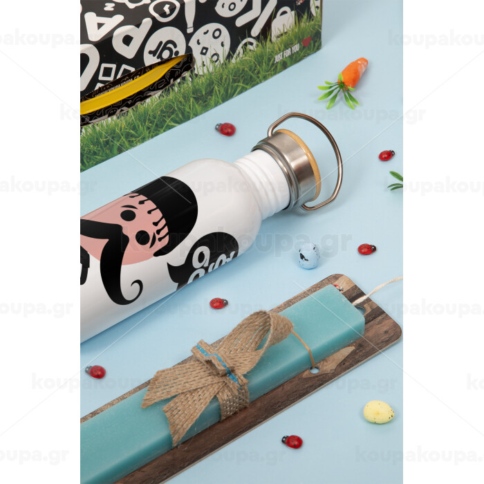 Κρητικός "Ξα σου", Πασχαλινή Λαμπάδα με παγούρι μεταλλικό (620ml, stainless steel) & κερί αρωματικό πλακέ (30cm) (ΤΙΡΚΟΥΑΖ)