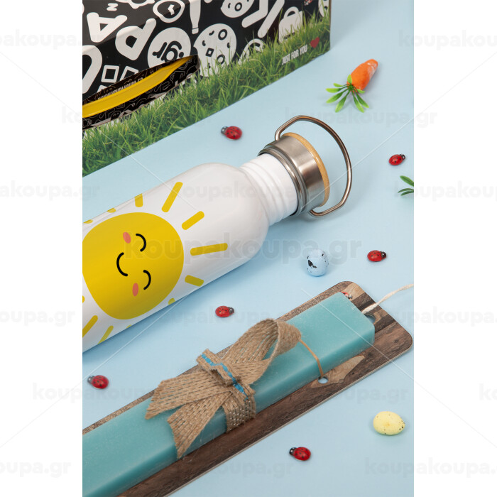 Happy sun, Πασχαλινή Λαμπάδα με παγούρι μεταλλικό (620ml, stainless steel) & κερί αρωματικό πλακέ (30cm) (ΤΙΡΚΟΥΑΖ)