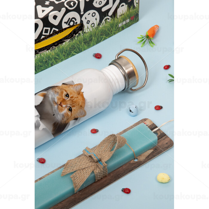Cat cracked, Πασχαλινή Λαμπάδα με παγούρι μεταλλικό (620ml, stainless steel) & κερί αρωματικό πλακέ (30cm) (ΤΙΡΚΟΥΑΖ)
