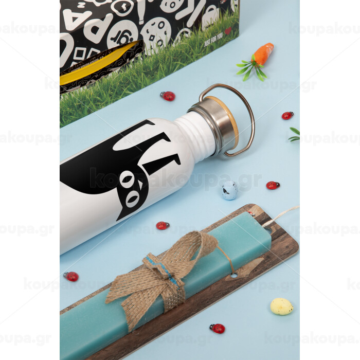 Cat upside down, Πασχαλινή Λαμπάδα με παγούρι μεταλλικό (620ml, stainless steel) & κερί αρωματικό πλακέ (30cm) (ΤΙΡΚΟΥΑΖ)