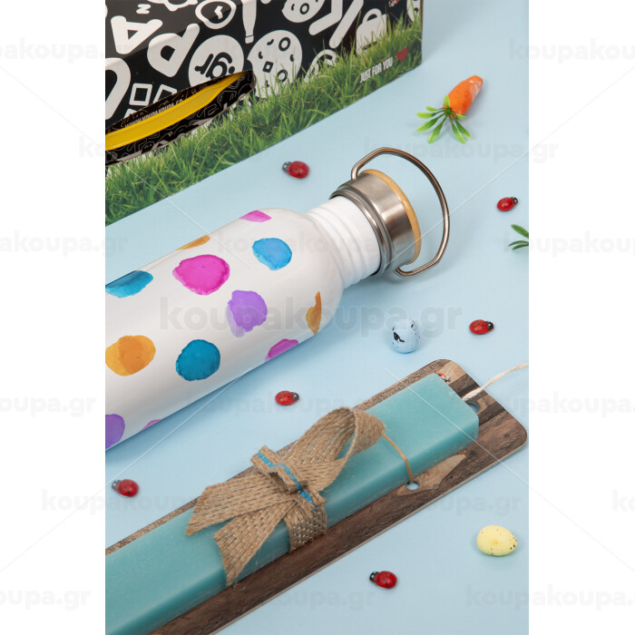 Watercolor dots, Πασχαλινή Λαμπάδα με παγούρι μεταλλικό (620ml, stainless steel) & κερί αρωματικό πλακέ (30cm) (ΤΙΡΚΟΥΑΖ)