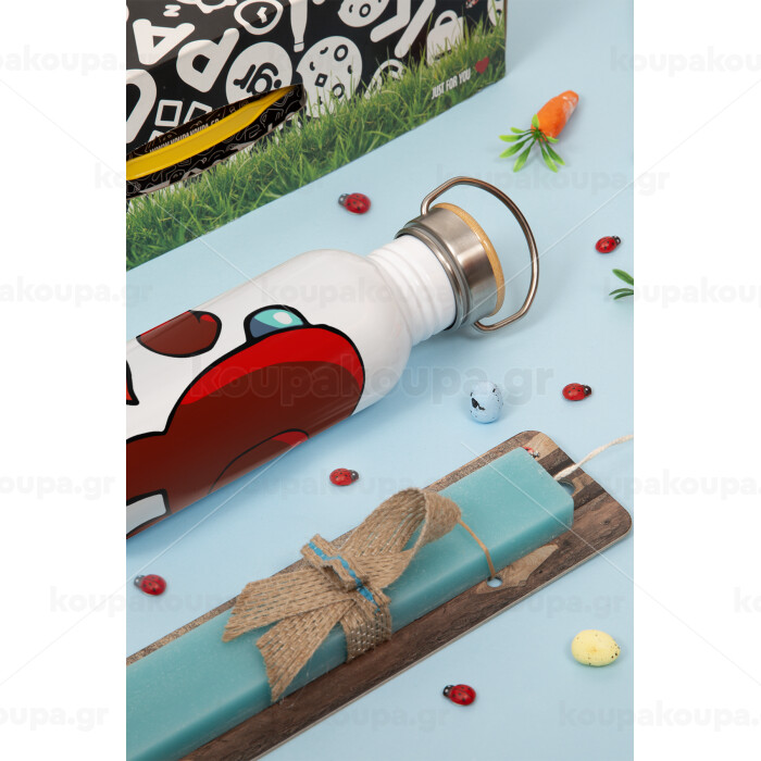 Among US i am impostor..., Πασχαλινή Λαμπάδα με παγούρι μεταλλικό Ασημένιο αλουμινίου (500ml) & κερί αρωματικό πλακέ (30cm) (ΤΙΡΚΟΥΑΖ)