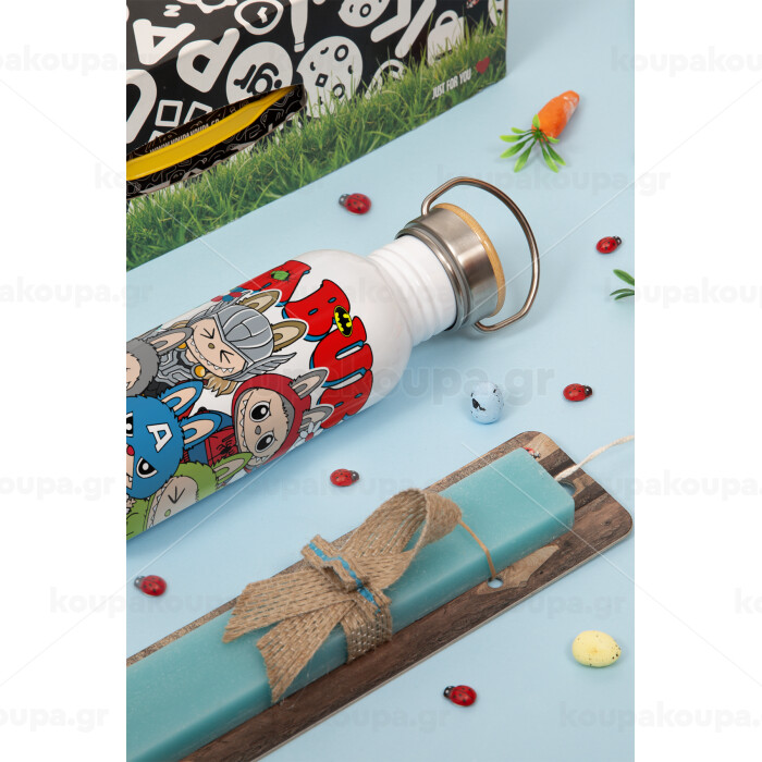 Labubu superheroes, Πασχαλινή Λαμπάδα με παγούρι μεταλλικό (620ml, stainless steel) & κερί αρωματικό πλακέ (30cm) (ΤΙΡΚΟΥΑΖ)