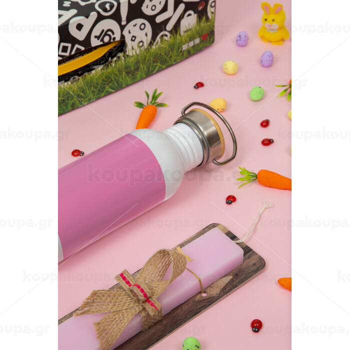 PANTONE Pink C, Πασχαλινή Λαμπάδα με παγούρι μεταλλικό (620ml, stainless steel) & κερί αρωματικό πλακέ (30cm) (ΡΟΖ)