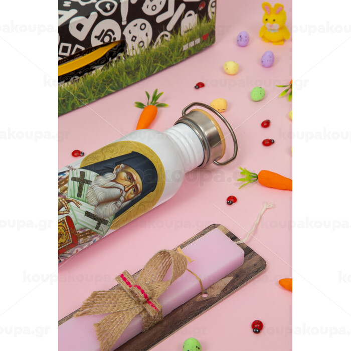 Άγιος Νεκτάριος, Πασχαλινή Λαμπάδα με παγούρι μεταλλικό (620ml, stainless steel) & κερί αρωματικό πλακέ (30cm) (ΡΟΖ)