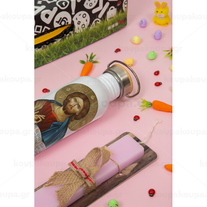 Ιησούς, Πασχαλινή Λαμπάδα με παγούρι μεταλλικό (620ml, stainless steel) & κερί αρωματικό πλακέ (30cm) (ΡΟΖ)
