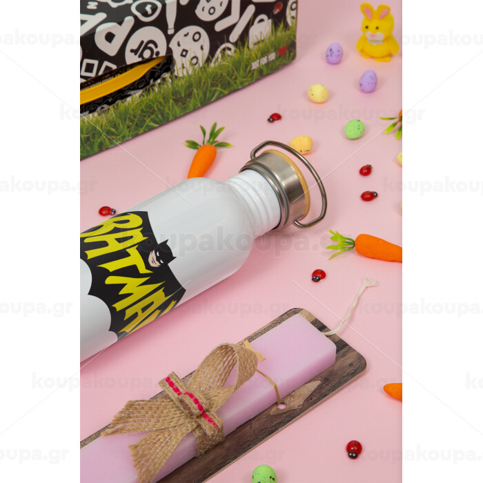 Batman classic logo, Πασχαλινή Λαμπάδα με παγούρι μεταλλικό (620ml, stainless steel) & κερί αρωματικό πλακέ (30cm) (ΡΟΖ)