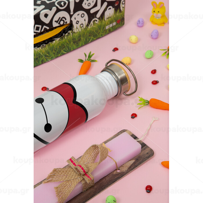 Baymax heart, Πασχαλινή Λαμπάδα με παγούρι μεταλλικό (620ml, stainless steel) & κερί αρωματικό πλακέ (30cm) (ΡΟΖ)