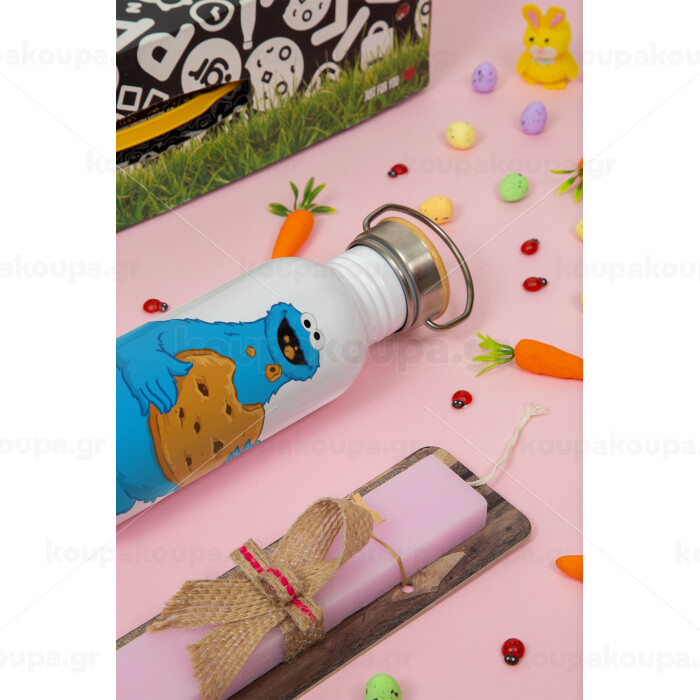Cookie Monster, Πασχαλινή Λαμπάδα με παγούρι μεταλλικό (620ml, stainless steel) & κερί αρωματικό πλακέ (30cm) (ΡΟΖ)