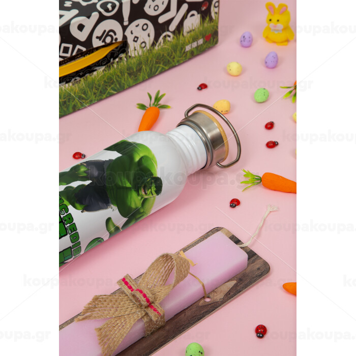 Hulk, Πασχαλινή Λαμπάδα με παγούρι μεταλλικό (620ml, stainless steel) & κερί αρωματικό πλακέ (30cm) (ΡΟΖ)