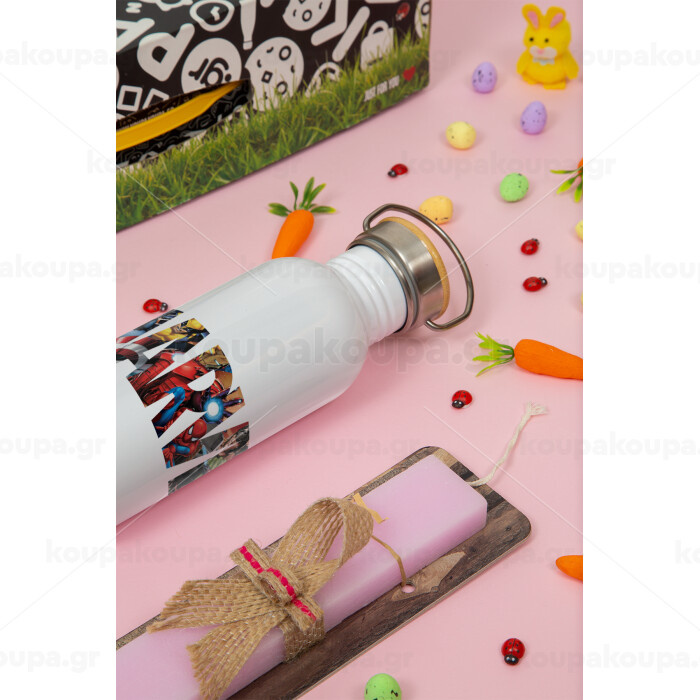 MARVEL characters, Πασχαλινή Λαμπάδα με παγούρι μεταλλικό (620ml, stainless steel) & κερί αρωματικό πλακέ (30cm) (ΡΟΖ)