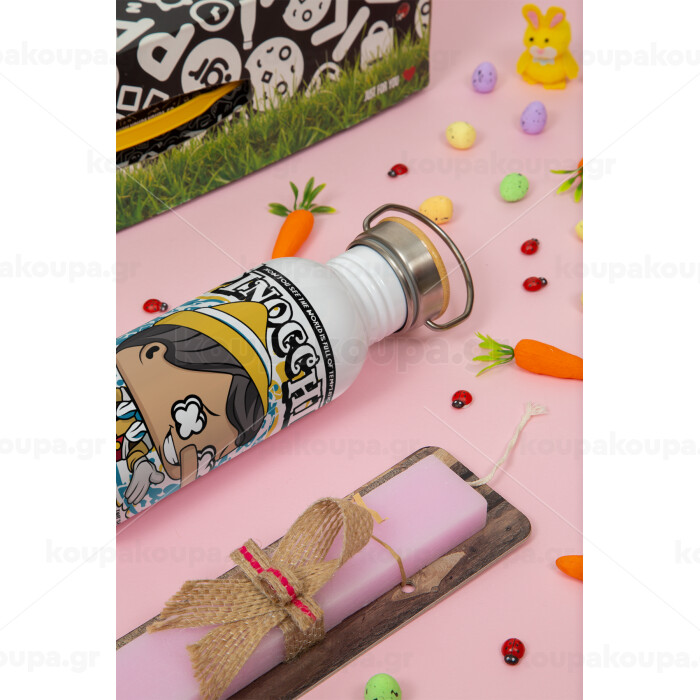 Pinocchio, Πασχαλινή Λαμπάδα με παγούρι μεταλλικό (620ml, stainless steel) & κερί αρωματικό πλακέ (30cm) (ΡΟΖ)