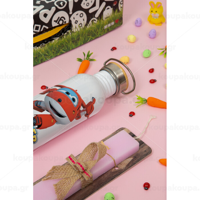 Super Wings, Πασχαλινή Λαμπάδα με παγούρι μεταλλικό (620ml, stainless steel) & κερί αρωματικό πλακέ (30cm) (ΡΟΖ)