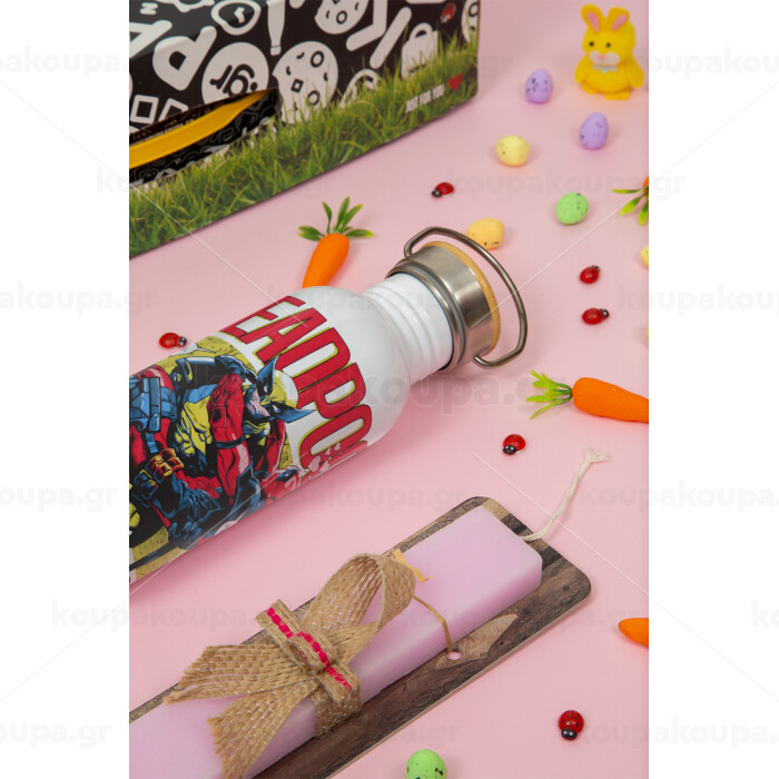 Superhero Deadpool Wolverine, Πασχαλινή Λαμπάδα με παγούρι μεταλλικό (620ml, stainless steel) & κερί αρωματικό πλακέ (30cm) (ΡΟΖ)