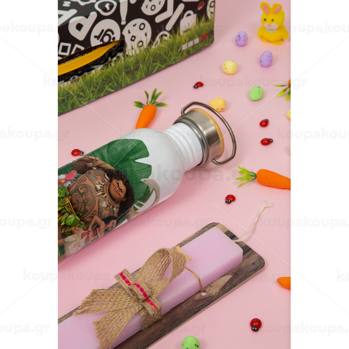 Vaiana, Πασχαλινή Λαμπάδα με παγούρι μεταλλικό (620ml, stainless steel) & κερί αρωματικό πλακέ (30cm) (ΡΟΖ)