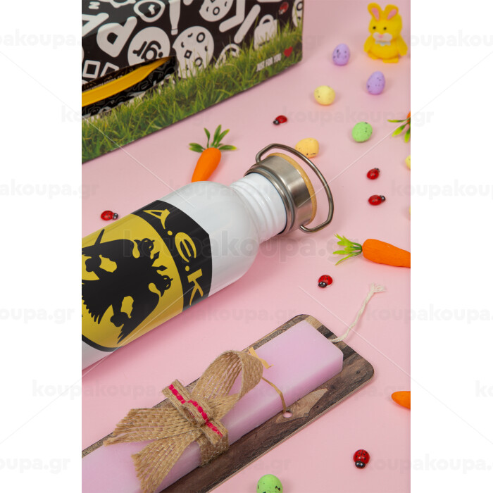 ΑΕΚ, Πασχαλινή Λαμπάδα με παγούρι μεταλλικό (620ml, stainless steel) & κερί αρωματικό πλακέ (30cm) (ΡΟΖ)