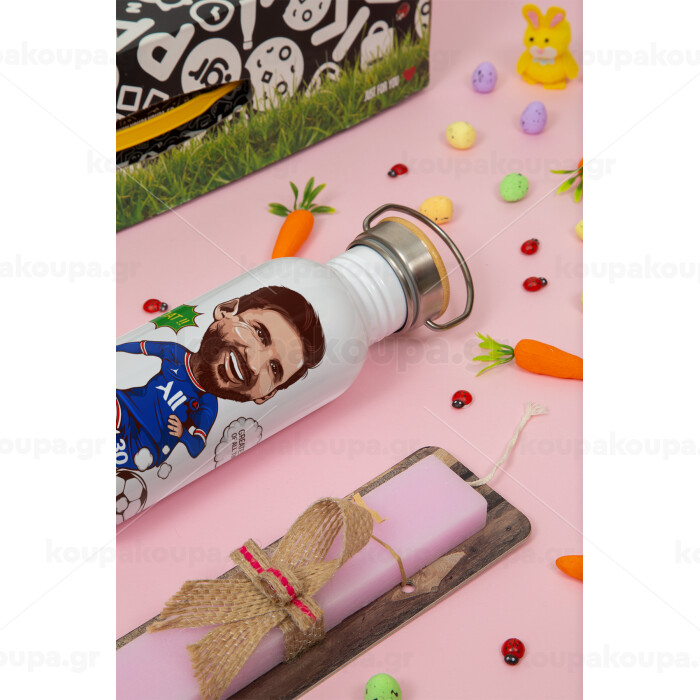 Lionel Messi drawing, Πασχαλινή Λαμπάδα με παγούρι μεταλλικό (620ml, stainless steel) & κερί αρωματικό πλακέ (30cm) (ΡΟΖ)
