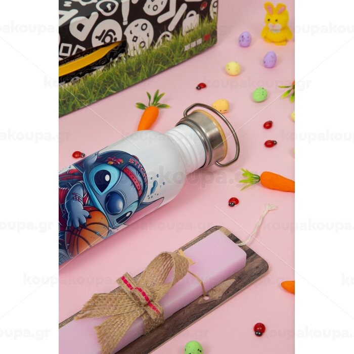 Stitch Basketball, Πασχαλινή Λαμπάδα με παγούρι μεταλλικό (620ml, stainless steel) & κερί αρωματικό πλακέ (30cm) (ΡΟΖ)