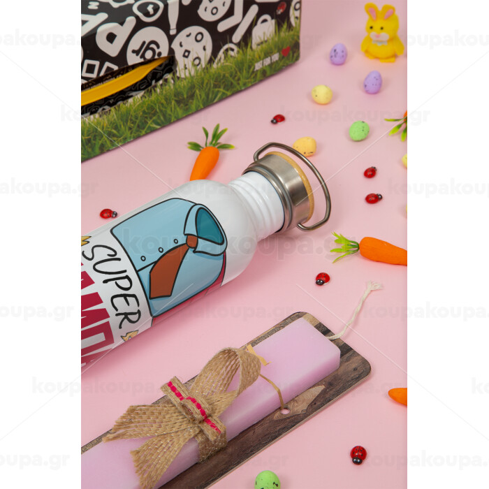 SUPER ΜΠΑΜΠΑΣ, Πασχαλινή Λαμπάδα με παγούρι μεταλλικό (620ml, stainless steel) & κερί αρωματικό πλακέ (30cm) (ΡΟΖ)