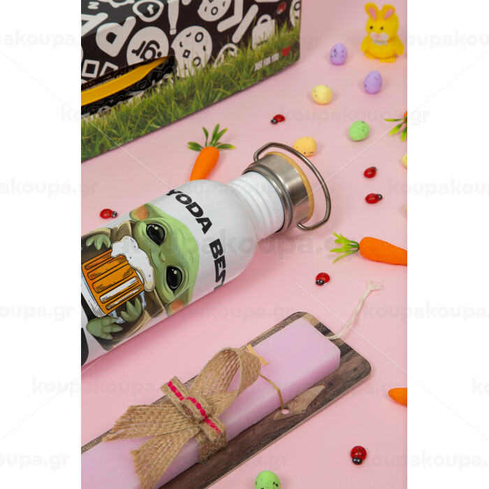Yoda Best Dad, Πασχαλινή Λαμπάδα με παγούρι μεταλλικό (620ml, stainless steel) & κερί αρωματικό πλακέ (30cm) (ΡΟΖ)