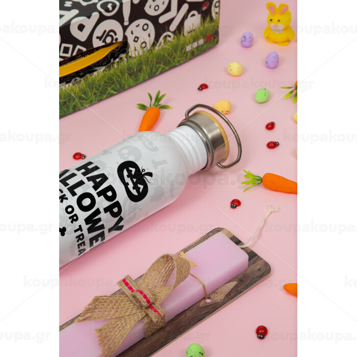 Happy Halloween pumpkin, Πασχαλινή Λαμπάδα με παγούρι μεταλλικό (620ml, stainless steel) & κερί αρωματικό πλακέ (30cm) (ΡΟΖ)