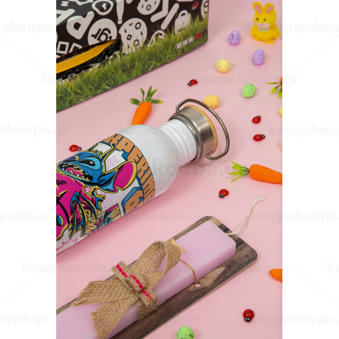 Stitch Experiment 626, Πασχαλινή Λαμπάδα με παγούρι μεταλλικό (620ml, stainless steel) & κερί αρωματικό πλακέ (30cm) (ΡΟΖ)